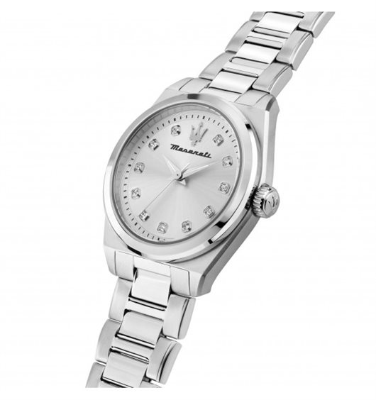 Orologio da donna con movimento al quarzo Miyota 2035 e funzione di solo tempo. Cassa in acciaio inox dal diametro di 35 mm. Quadrante analogico silver con cristalli bianchi agli indici e logo a ore 12. Cinturino in acciaio anallergico; chiusura deployante con pulsanti. Resistente all'acqua fino a 50 metri di profondità. Appartiene alla collezione Velocità.